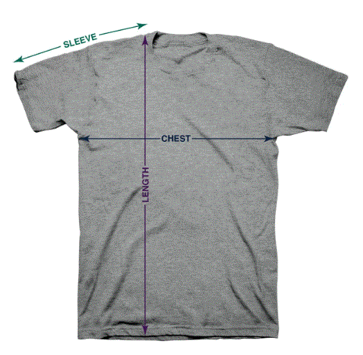 Chest = from 1 inch below arm hole, measure across shirt to the same point on opposite side.